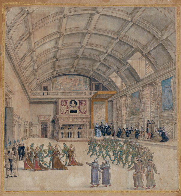 Maskerade in de feestzaal van het paleis van Binche (anoniem, rond 1549-1550)