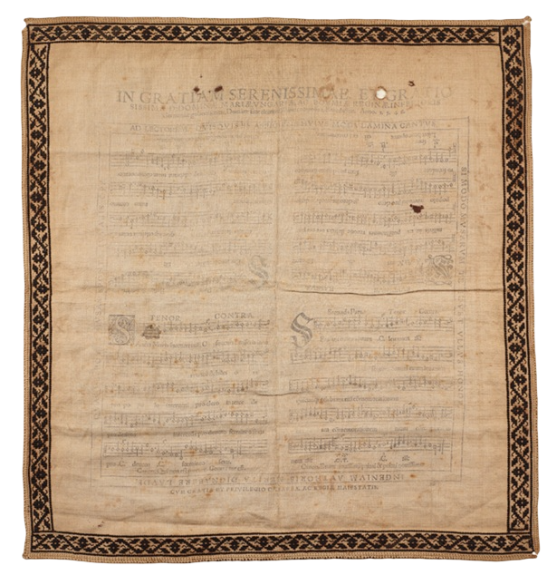 Bedrukte en geborduurde zakdoek met het lied 'Canon Sancta Maria succurre miseris' van Benedictus Appenzeller (1548)
