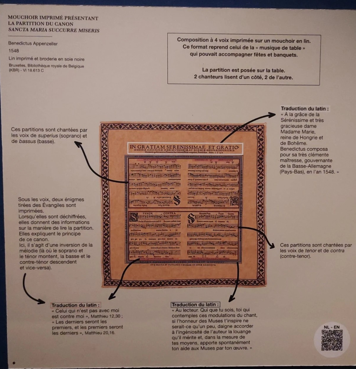 Een bijzonder object is een zakdoek uit 1548 waarop een lied voor Maria is gedrukt. Het lied is speciaal voor deze expo ingezongen, en ter plekke te bekijken en te beluisteren.
