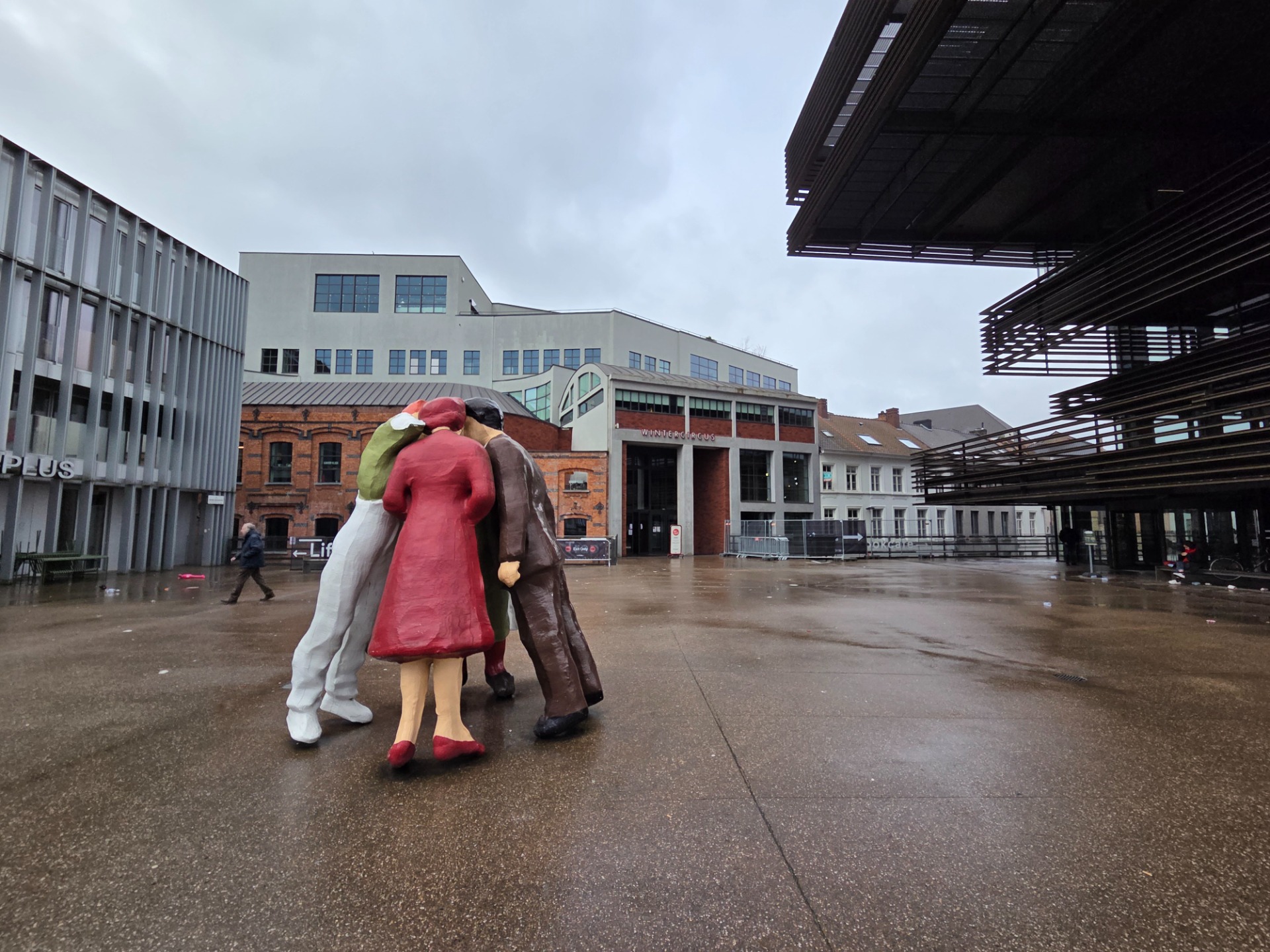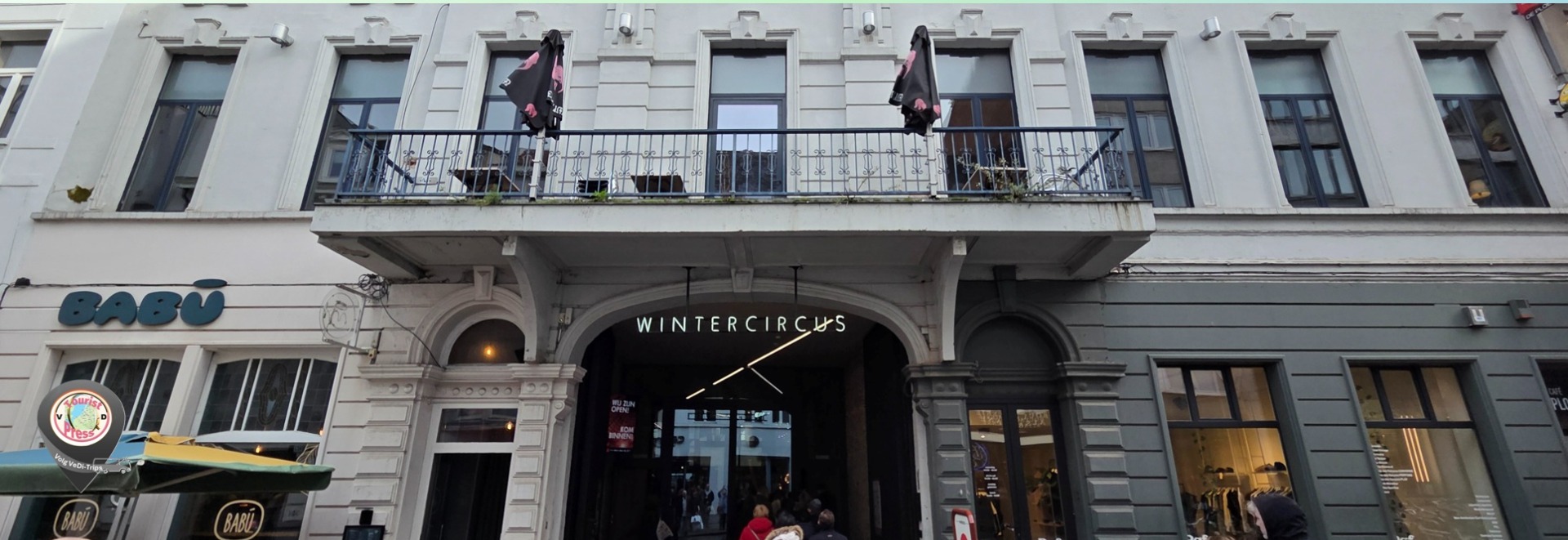Zodra we samen de hoek omslaan richting een volgende ingang van het Wintercircus, bouwt de spanning zich op. Van buitenaf zie je slechts fragmenten van het gebouw, wat de verrassing binnenin alleen maar groter maakt.