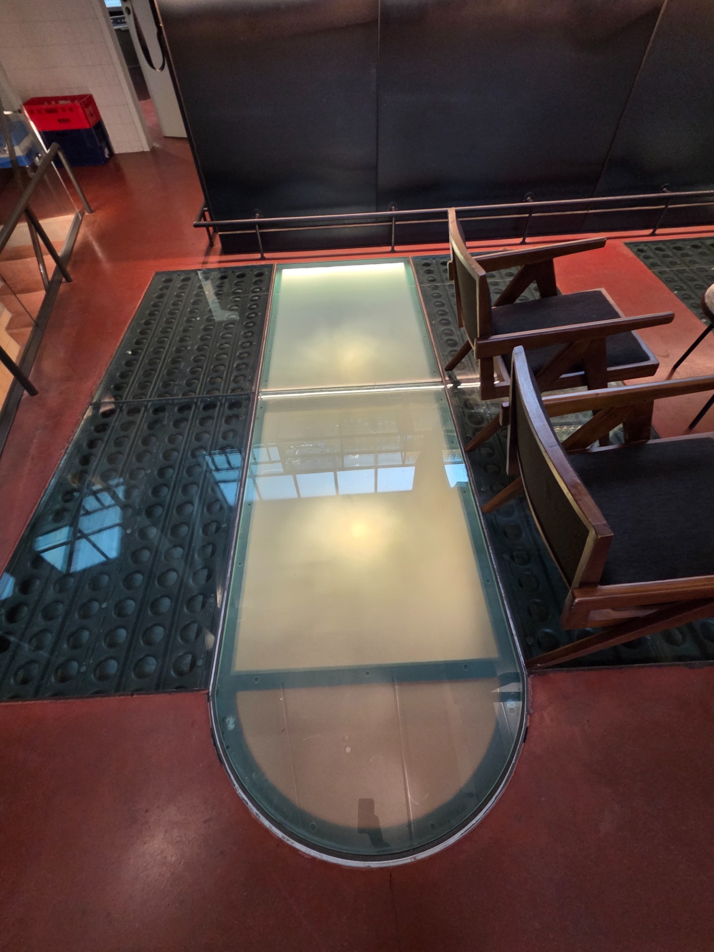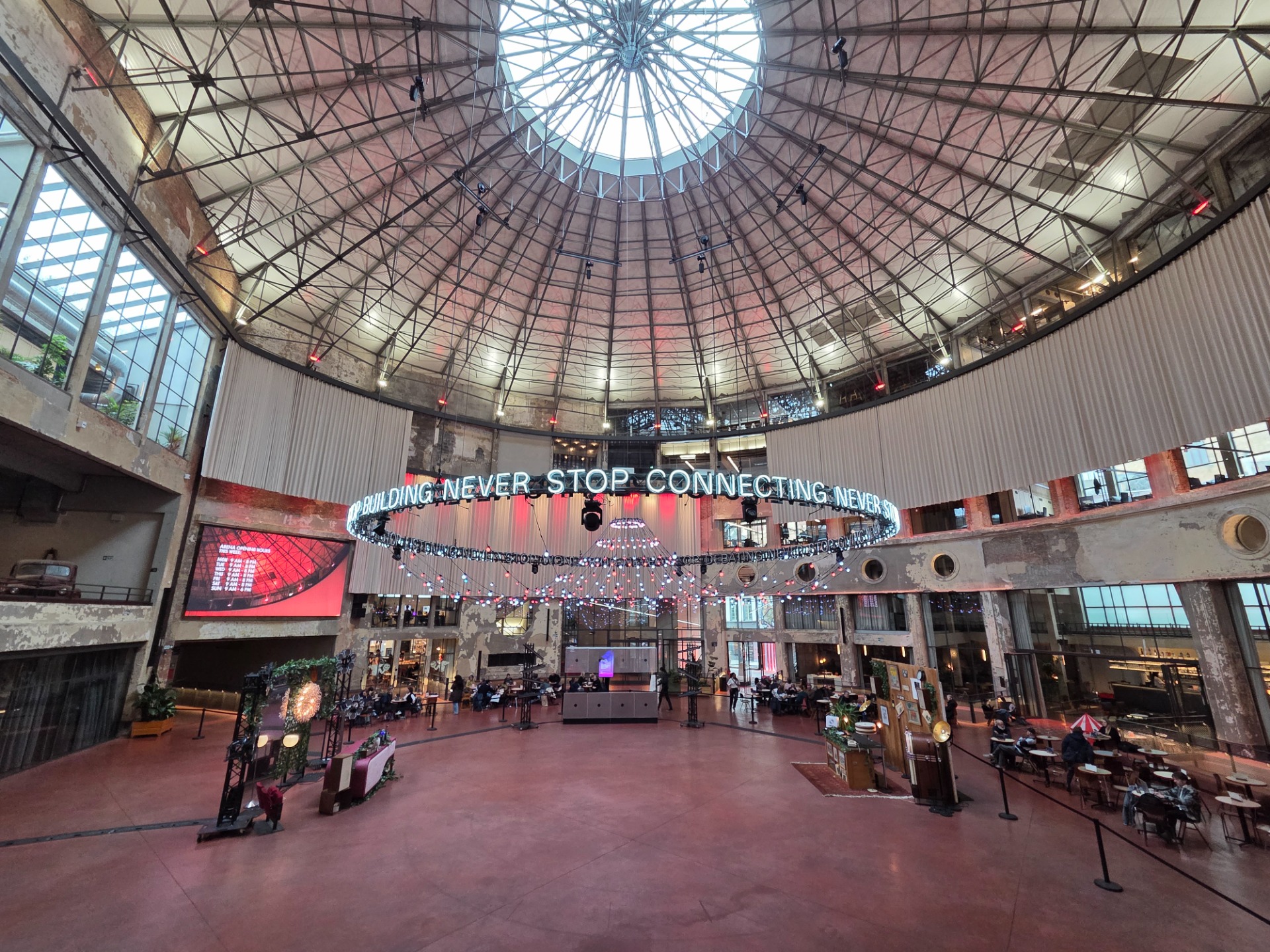 Wanneer we de deuren openen en de centrale middenpiste binnenstappen, vallen we even stil. De schaal van het gebouw overvalt je. Het is een enorme, ronde ruimte waar het daglicht gul naar binnen valt door de immense glazen dakkoepel. Het licht tekent strakke, wisselende schaduwen op de opvallende rode, betonnen vloer.