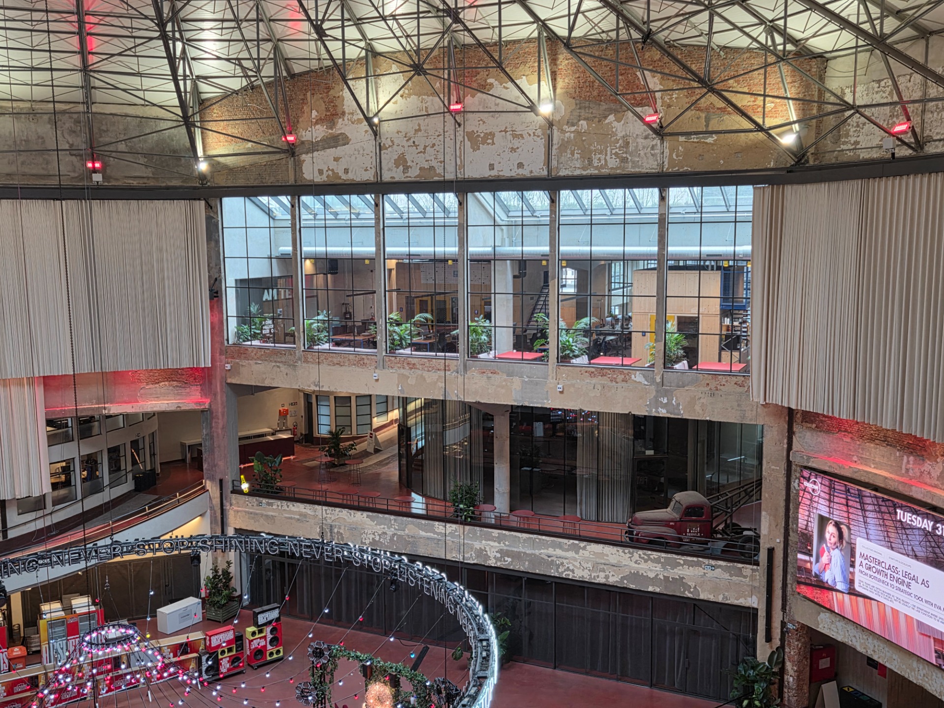 Het is exact die gelaagdheid die het bezoek zo bijzonder maakt. Je ervaart het gebouw met al je zintuigen. Je ruikt de aangename geur van verse koffie uit de nieuwe horecazaken die zich in de randen van het gebouw nestelen. Tegelijk voel je de ruwe, industriële geschiedenis in de bewust onafgewerkte bakstenen muren. De lucht voelt fris en ruimtelijk aan. Overal waar je blik naartoe dwaalt, ontdek je een nieuw detail. Oude en ooit verweerde stalen balken kruisen harmonieus met de strakke, moderne afwerking van glas en hout.